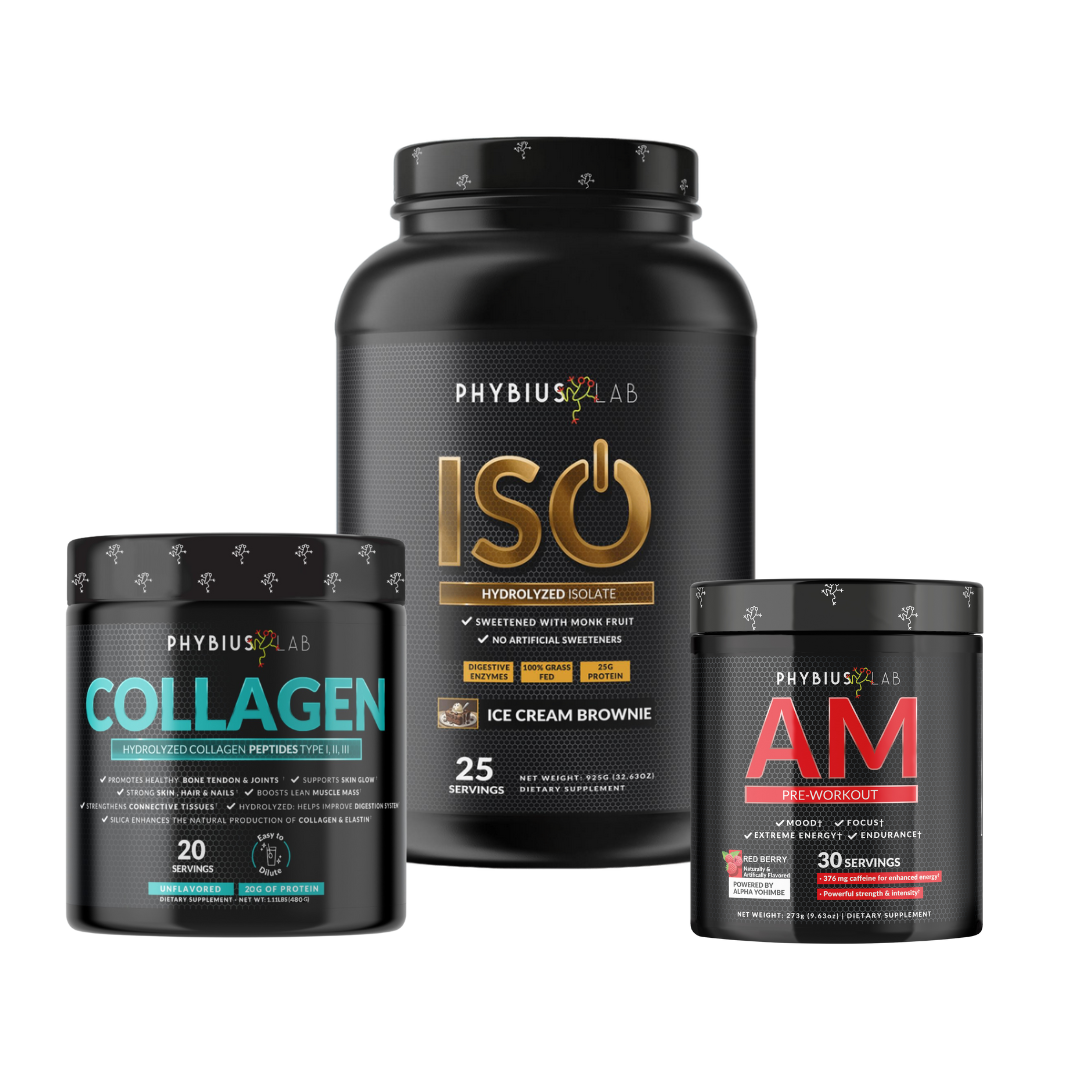 Phybius Happy Meal Bundle is an exclusive package designed to enhance your fitness performance, muscle recovery, and overall health. This bundle includes AM Pre-Workout, Iso Protein, and Hydrolyzed Collagen.
